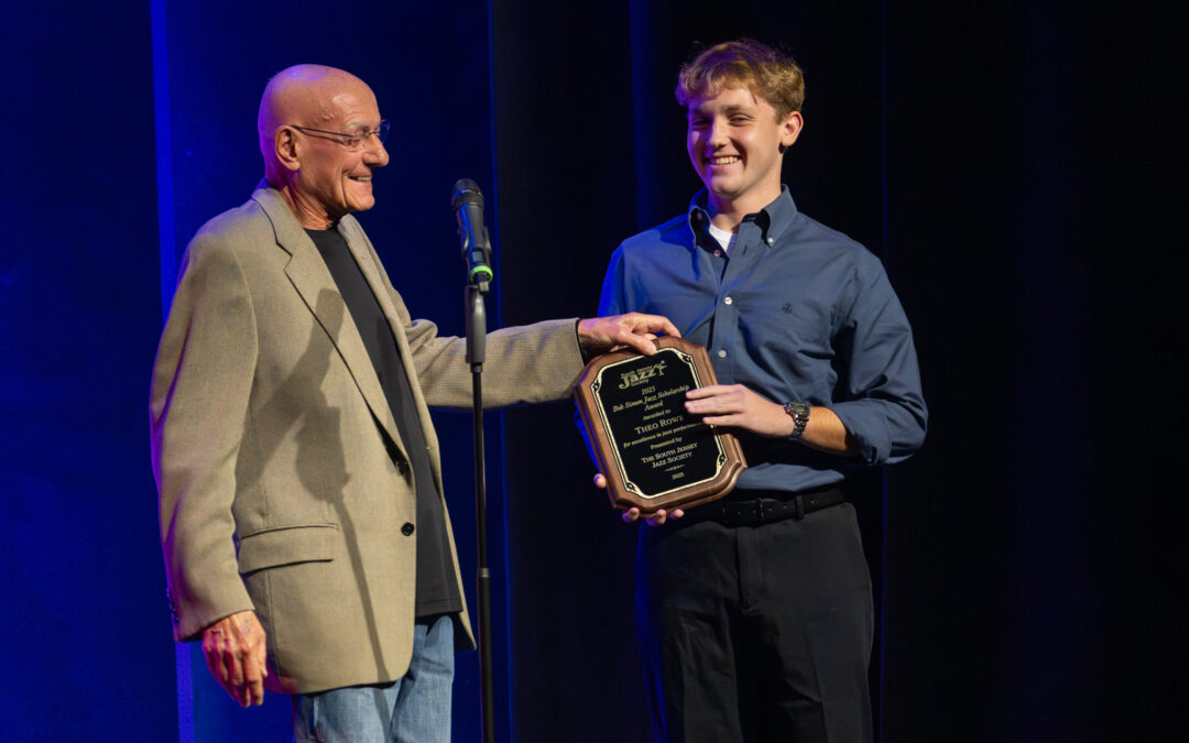 South Jersey Jazz Society (SJJS) presented its annual Bob Simon Jazz Scholarship to Theo Rowe, a senior at Mainland Regional High School, for his extraordinary talent on the saxophone at its recent festival, Jazz@ThePoint. Rowe was presented with the scholarship by SJJS board member Michael Pedicin prior to the John Pizzarelli concert during SJJS’s jazz festival on Oct. 18.