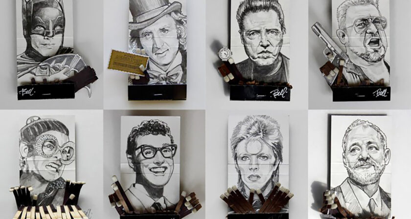 Today, Bell is celebrated for his vibrant canvases that depict classic monsters and movie icons in modern, unexpected scenarios. He has earned praise for his detailed black-and-white pencil portraits on matchbooks, often using used matches for a 3D effect. Bell’s matchbook art has been displayed in Ripley’s Believe It or Not! Museums.
