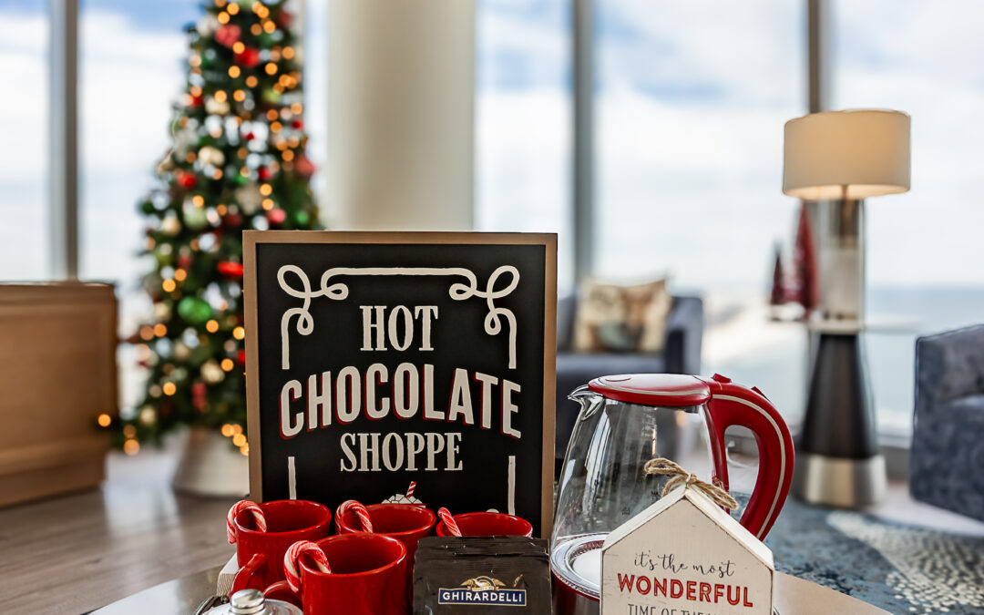 I began my stay in one of Ocean’s holiday-themed rooms, where festive elements were incorporated without overwhelming the space. A decorated tree, understated seasonal accents and a hot chocolate kit added warmth to the modern design. For the third consecutive year, the resort has reimagined their guest rooms with coordinated holiday décor. The seasonal dressings were nice, but for me, the star of the show was the view. Expansive floor to ceiling windows from our room on the 36th floor framed the city and shoreline from a bird’s eye view.