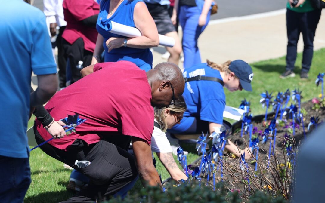 The blue and silver pinwheels symbolize childhood innocence and the carefree experiences that should define childhood, according to Curtis Still, Director of Youth Services.