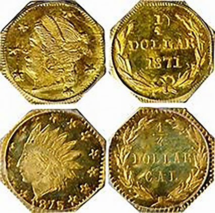 To help alleviate the problem, some jewelers struck small denomination coins in 25-cent, 50-cent and dollar denominations, a practice that started in 1852 and continued until the 1880s. The amount of gold equaled their worth, so some were very small. Unfortunately, these tiny coins weren’t popular and in many cases were mailed back home as souvenirs. In other instances, assayers struck bars and coins in denominations of $1, $5, $10, $20, $25 and $50. Both series are quite collectible, but the higher denomination assayer coins and bars are rare whereas the little coins are more affordable. The small 25-cent, 50-cent and dollar cents all had their denomination on them with either a “D”, “DOL” or “DOLLAR” after ¼, ½ or 1 for the amount. Many copies and tokens exist that are not to be confused with the real thing, they all lack the “D, “DOL” or “DOLLAR” notation. I have seen many instances where collectors have purchased the tokens thinking they are the real thing. Real California small denomination gold “coins” sell in the hundreds of dollars where the tokens are usually only worth a couple of dollars.