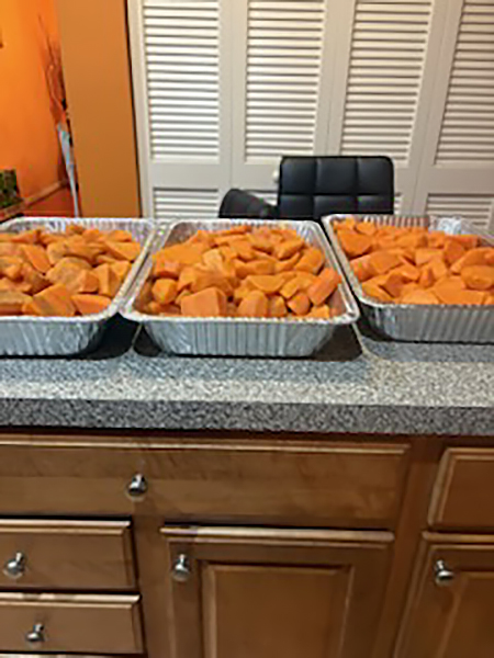 Friends now gather at McNair’s home to cook, pack and deliver meals. On the Saturday before Thanksgiving this year, the group prepared 250 meals, each accompanied by desserts, water and juice. Volunteers worked side by side, chopping vegetables, candying yams and carefully packing each bag with warmth and attention.