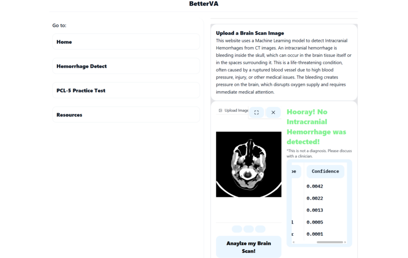 The app, named BetterVeteran, offers tools aimed at early awareness and connection to care. Users can upload brain scan images and receive an easy-to-understand indicator highlighting potential risks associated with certain types of brain bleeds. It also features a PTSD self-assessment tool modeled after the structure of the PCL-5 questionnaire, allowing veterans to better gauge their symptoms and determine whether professional care may be needed.