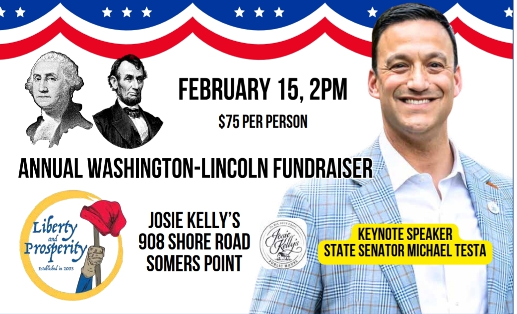 Liberty and Prosperity will hold its yearly fundraiser on President’s Day weekend. The event will include an appearance by keynote speaker, state Sen. Michael Testa. Tickets are $75 and include lunch, dessert and a cash bar. For details, visit www.libertyandprosperity.com, email info@libertyandprosperity.com, or leave a voicemail at 609-927-7333.