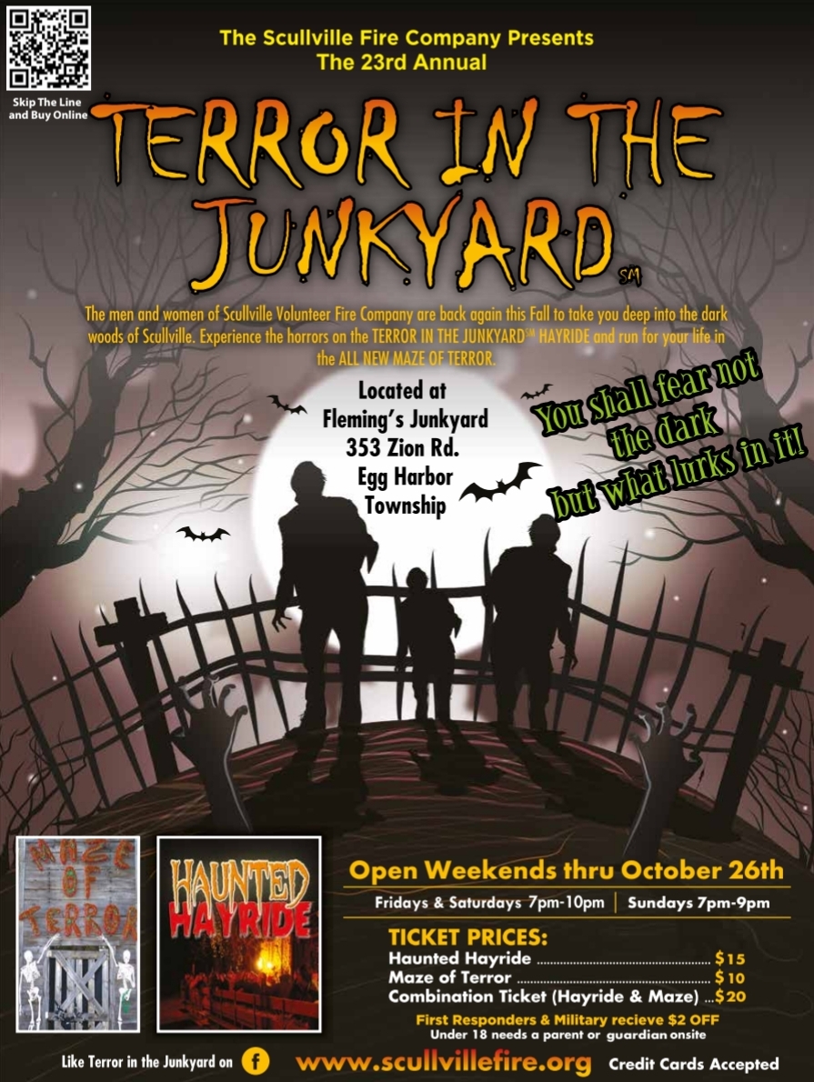 Presented by the Scullville Volunteer Fire Company is the “Terror in the Junkyard” haunted hayride and “Maze of Terror.” Every Friday, Saturday and Sunday in October, volunteers come together to scare visitors at Fleming’s Junkyard. Tickets are $15 for the hayride, $10 for the maze and $20 for both.