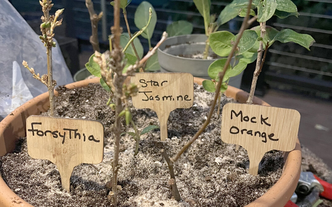 When you have all your supplies assembled, look for a nonflowering stem that is approximately six to eight inches long, and cut just below a leaf node. You should have a few more leaf nodes on the stem before you get to the top. If your cutting still has leaves, remove all but the top set. Dip the end of the stem in the rooting hormone and shake off the excess. Then make a two to four-inch hole with a pencil in your soil. Push your cutting into the hole and firm the soil around the stem. Water the soil well, making sure it drains so that your cutting doesn’t rot. You should take a few cuttings from each type of plant that you want to propagate to increase your odds for success. Be sure to label each cutting, because you will not remember what it is. Unlike softwood cuttings taken in spring, these hardwood cuttings will probably not have leaves to help you identify the plant.