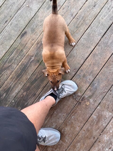 Putting the puppy into what I call a “settle hug” is my favorite way to teach the puppy to dial down their actions while teaching them to regulate their behavior and settle themselves down. I noticed recently that this tip is not as well-known as I had assumed. I was a bit surprised that several people who have been over to visit my puppies have tried to deal with the biting by holding the puppy suspended up in the air, resulting in the puppy struggling to get back to the ground and increasing their frustration. The goal with an overly bitey puppy is to calm them, not add to their overstimulation. I will, if walking, pick my puppies up, hold them close and keep on moving. I say nothing and merely place the puppy on the floor with zero fanfare once they have settled. If I am not walking, I hold them in my lap, pointing their faces away from me, then gently hug and pet them down the length of the spine. Once the puppy settles, I let them go.