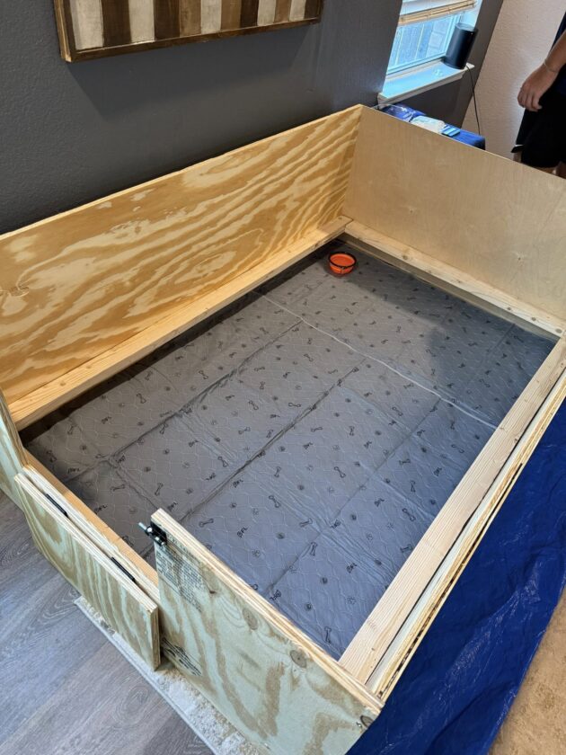 In a quiet room, I set up a whelping box, which is where the puppies will live for about two to three weeks before their eyes open. It is a big, sturdy box with a removable entry/exit. That way, the puppies’ mom can get in and out easily, but the entrance can still be blocked to prevent the puppies from climbing out once they start to move around. To keep everything clean, I put down a waterproof carpet and lined the inside of the box with washable hospital pads. Since puppies are not able to regulate their body temperatures at birth, I placed a heating pad in one corner of the box. If the puppies want heat, they can crawl to it, but it prevents their mom from getting overheated.