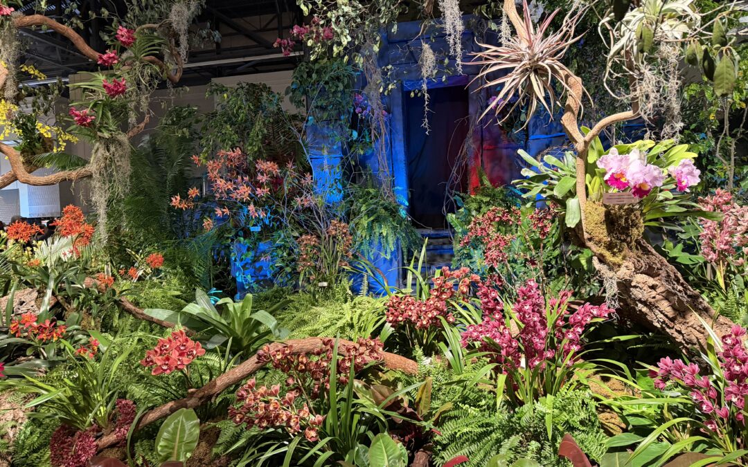 Of course, our local South Jersey favorite, Waldor Orchids of Linwood, dazzled with their award-winning display, titled “The Orchid Kingdom,” which won the “American Orchid Society Show Trophy” for the most meritorious orchid exhibit. This magical display was bursting with vibrant, exotic orchids covering “ancient ruins” as water trickled from the structure. A cork tree with moss-covered sassafras branches hosted giant tillandsia and breath-taking orchids. Waldor Orchids explained how this “Orchid Kingdom” fits into the “rooted” theme: “Orchids are a treasure in the plant kingdom. From large, fragrant blossoms to the smallest bloom, their beauty has enticed a passion in humankind for thousands of years. From ancient civilizations — and the great orchid discoveries of the eighteenth century — to modern times, methods have changed, markets have shifted, and science has advanced. However, fascination with orchids has endured, shared and rediscovered by each new generation.”