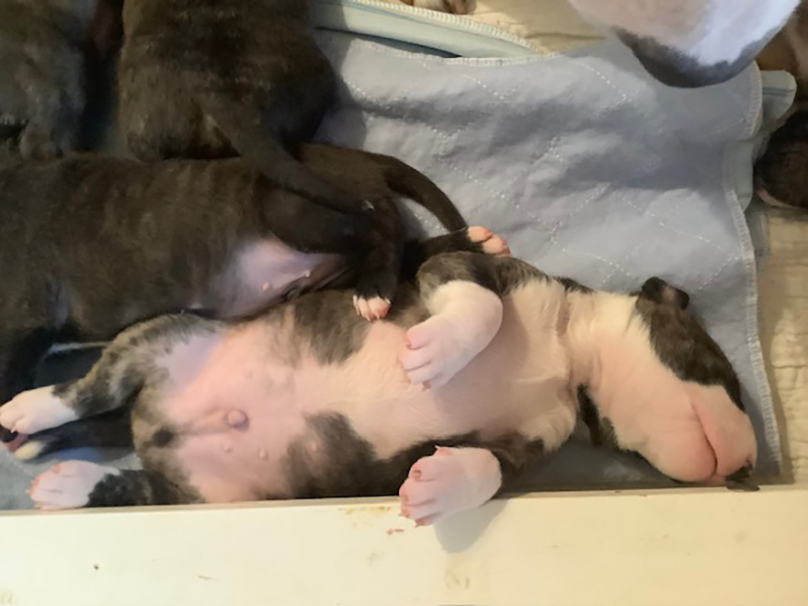 Another milestone is they have started to go to the bathroom on their own. I have added a little puppy bed to the box and a plush toy that they will instinctively crawl away from to urinate. They have pooped on their own, but usually at this point in their lives, their mothers are still harboring intense maternal instincts where they are still cleaning the pups’ butts. It is a big deal that puppies learn to potty away from where they sleep as they age, especially when I start to crate-train them and begin the housebreaking process.