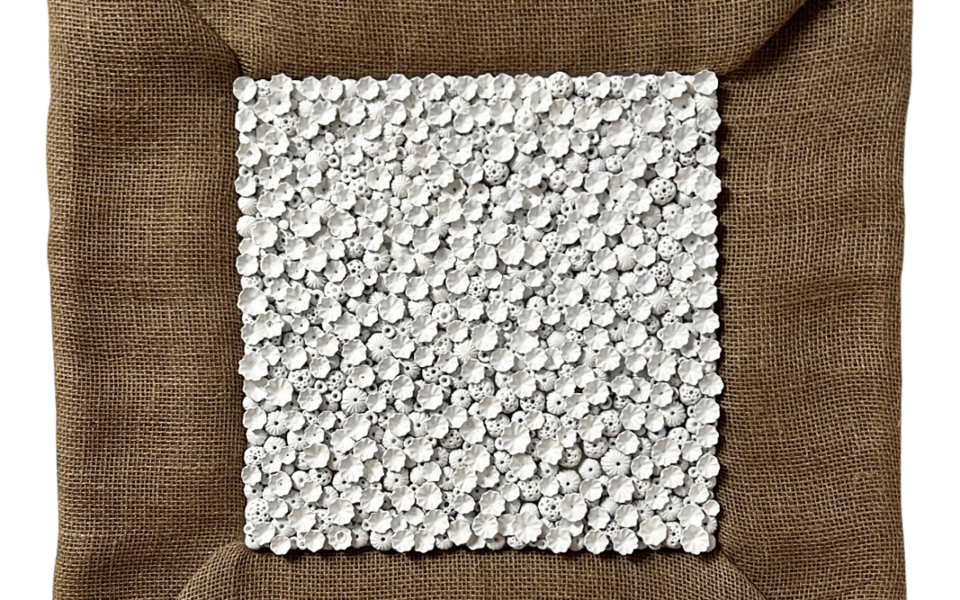 Ekaterina says, “I create woven textile works and clay pieces that explore form through touch, structure, and rhythm. My fiber practice is rooted in building surface and dimension through weaving, knotting, and layering, drawing from traditional techniques while approaching them in a contemporary context. Working with clay introduces a physical dialogue between control and unpredictability, allowing me to shape grounded, tactile forms that contrast with the flexibility of fiber.