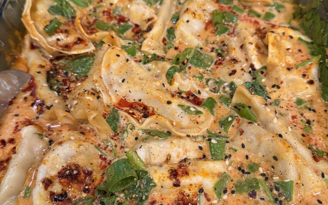 Next, you will want to add your potstickers to the dish. You can find potstickers in the frozen food section of your grocery store. They can be found with pork or with chicken and vegetables. Ones with just vegetables are also an option, to keep it vegetarian. You can also substitute frozen dumplings. I like to add these before the vegetables so that I can stir them around and make sure they are covered in that delicious sauce. Once you have mixed them in the sauce, arrange them in a single layer. For a 9 x 13 dish, I was able to fit most of a large bag of potstickers. Now you have a choice for your vegetables; you can add chopped baby bok choy, a few handfuls of chopped fresh baby spinach or a combination of both. Lastly, I topped everything with some cilantro and green onions, and drizzled some chili oil crunch over the top. Don’t be overwhelmed if this seems like too many ingredients. Recipes are always meant to be adapted for your own personal taste. If you think chili oil is too spicy for your palate? Skip it. Are you fresh out of cilantro and green onions? No problem. Use the ingredients that you have at your disposal and make substitutions. You may develop your own favorite way of enjoying this dish.