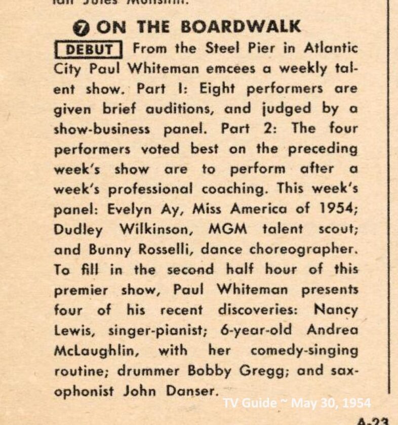Whiteman then moved his television operation to the Steel Pier in Atlantic City. “On the Boardwalk with Paul Whiteman,” which aired on ABC on Sunday nights from May 30, to Aug. 1, 1954, may have been the first live television show ever broadcast from Atlantic City.