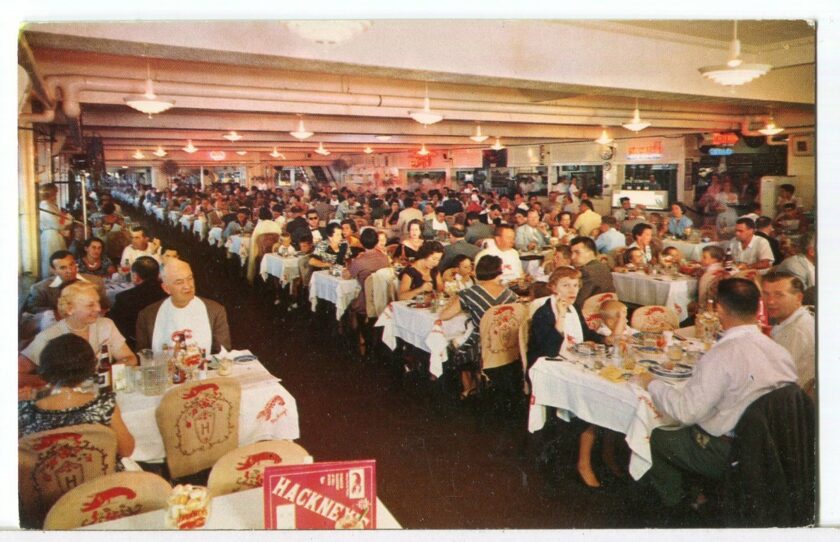 Though the menu was extensive, lobster was the specialty, offered in every variety a diner could think of, including fried lobster, rock lobster tails, a special baby lobster platter, Icelandic baby lobster tails, lobster thermidor, a lobster cutlet – whatever that was – lobster salad, lobster cocktail, lobster Newberg, and, of course, Hackney’s famous $5 lobster platter. Who could ask for anything more?