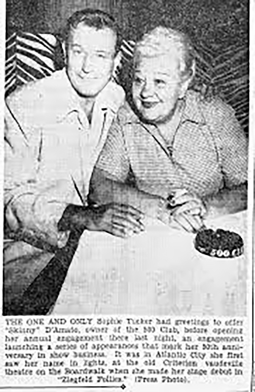 “On July 26, 1946, Skinny and his partner Irvin Wolf booked the 62-year-old legend Sophie Tucker into the back room, where the gambling took place,” Van Meter wrote. “Tucker began appearing in Atlantic City as early as 1909, during the resort’s vaudeville heyday. Skinny quickly realized that she brought in gamblers. She would become a mainstay at the nightclub and one of Skinny’s dearest friends, appearing there many times until her death some 20 years later.”