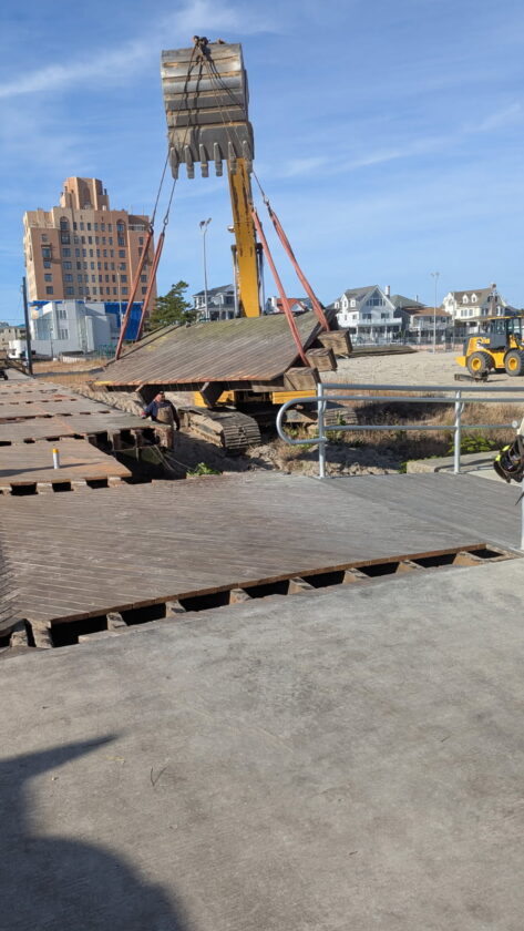 Crews demolished the boardwalk, moving from Suffolk Avenue to Cambridge.