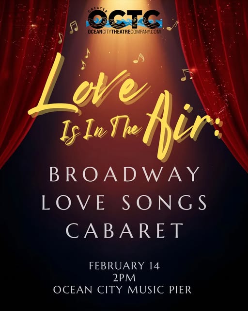 The Greater Ocean City Theatre Company will celebrate love with some of the most enchanting and unforgettable songs to ever grace the Broadway stage at 2 p.m. Saturday, Feb. 14. Bring that special someone, your family, a friend or let Broadway be your Valentine this year for the “Love is in the Air” show at the Ocean City Music Pier.